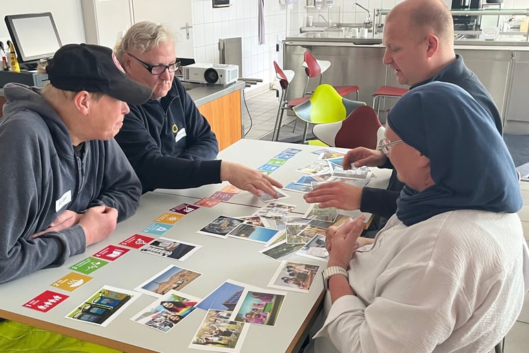 After the presentation of the project and the products and results developed over two years, activities from the e-book on the topics of climate change, water, energy, and waste were tried out at four themed tables. The practical exercises were guided by Monika Krocke and Kaya Klein from the cooperation partner Umweltlernen with the following questions:
